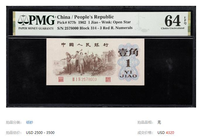 在2024年的10月香港的网拍上,一张1962年的一角纸币背绿水印版,拍出了4320好意思元的高价,额外于东说念主民币3万多块钱。这张纸币是64分的评级币,再加上它是背绿水印版的一角纸币,是以它能拍出这样高的价钱。