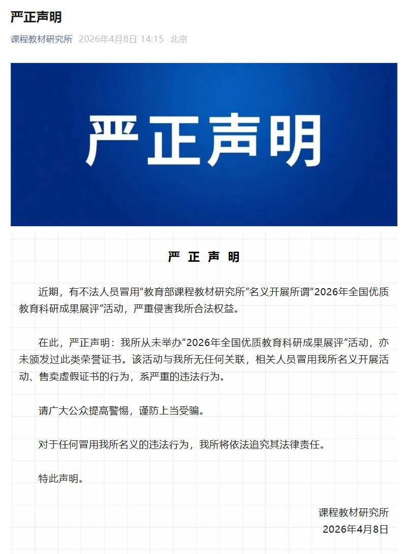 近日,诠释部直属作事单元课程讲义研究所通过微信公众号发布严正声明:近期,有犯科东谈主员冒用“诠释部课程讲义研究所”花样开展所谓“2026年宇宙优质诠释科研恶果展评”举止,严重侵害我所正当权力。