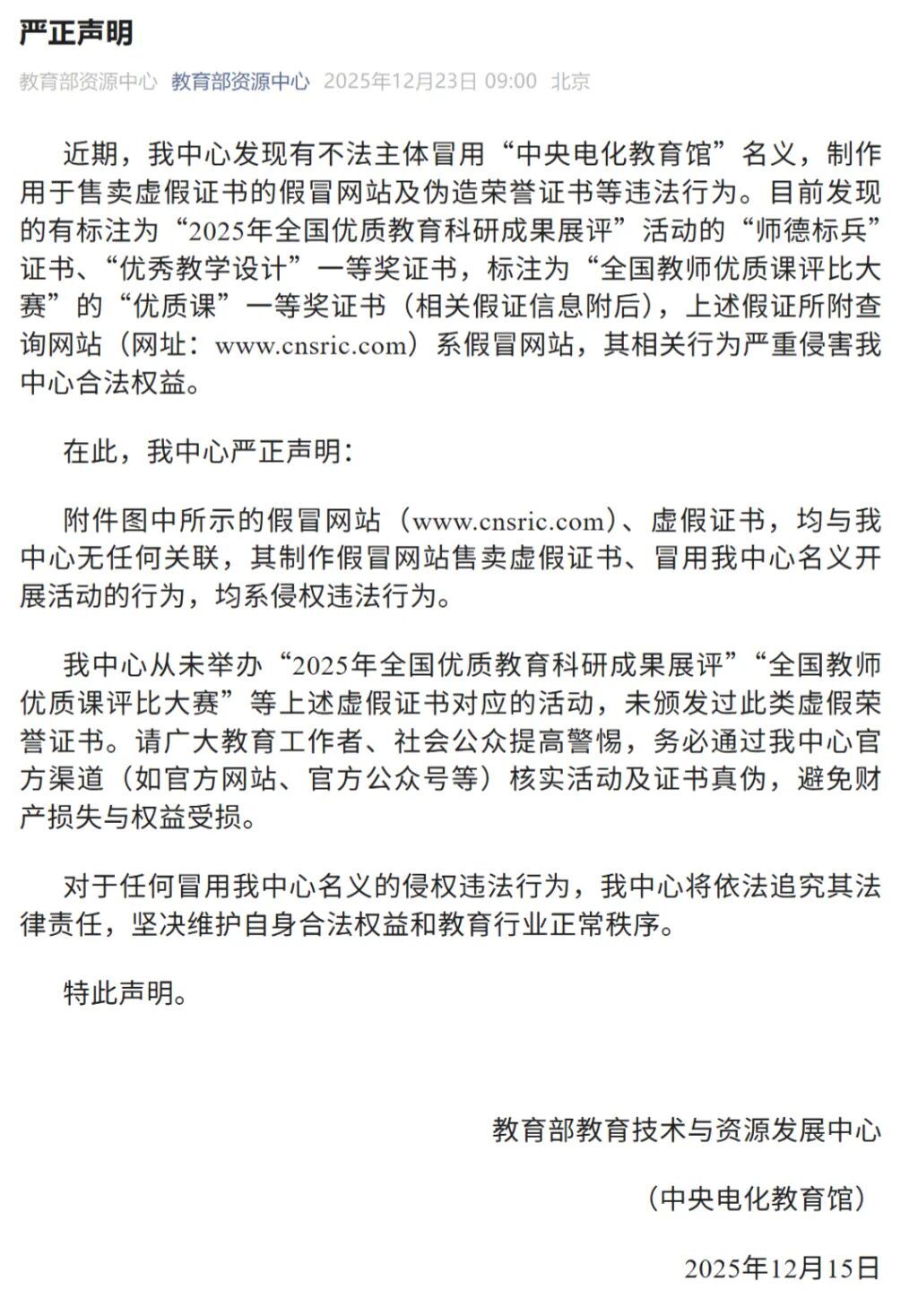 2025年12月,诠释部资源中心曾经发布严正声明:近期,我中心发现存犯科主体冒用“中央电化诠释馆”花样,制作用于售卖失实文凭的假冒网站及伪造荣誉文凭等犯科步履。现在发现的有标注为“2025年宇宙优质诠释科研恶果展评”举止的“师德尖兵”文凭、“优秀训导遐想”一等奖文凭,标注为“宇宙进修优质课评选大赛”的“优质课”一等奖文凭(有关假证信息附后),上述假证所附查询网站(网址:www.cnsric.com)系假冒网站,其有关步履严重侵害我中心正当权力。