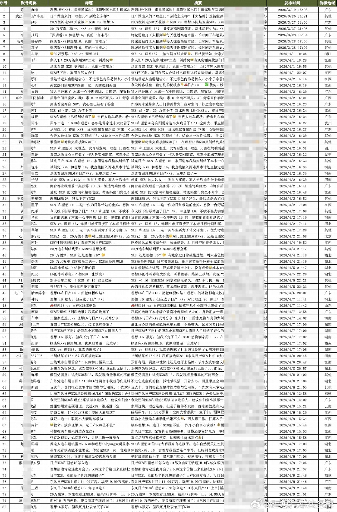 但理念念汽车法务部径直晒出了酬酢平台指摘区截图和统计信息。其称,在上周NX8上市后,汇注平台上纠合出现边远将理念念i6、理念念L6与NX8进行不妥对比、坏心拉踩的贴文。这些内容大多以“买车二选一”为模板,高度同质化,且发文IP地址与发布时期畸形纠合,呈现出彰着的组织化印迹。