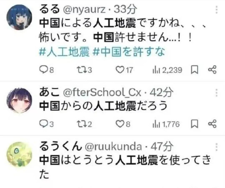 日本社交平台X上飞速冒出了一堆熟谙的论调——“这是中国制造的东说念主工地震"。