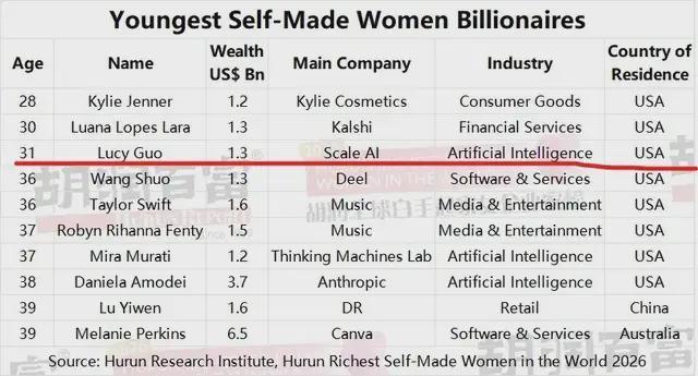 在胡润盘考院2026年3月发布的《人人富豪榜》上,一批深耕AI边界的女性创业者格外珍摄。其中,31岁的华侨女性LucyGuo一骑绝尘,以90亿元东谈主民币身家登顶人人90后空手起家女首富,成为AI造富波澜里最鲜嫩、最具外传颜色的缩影。