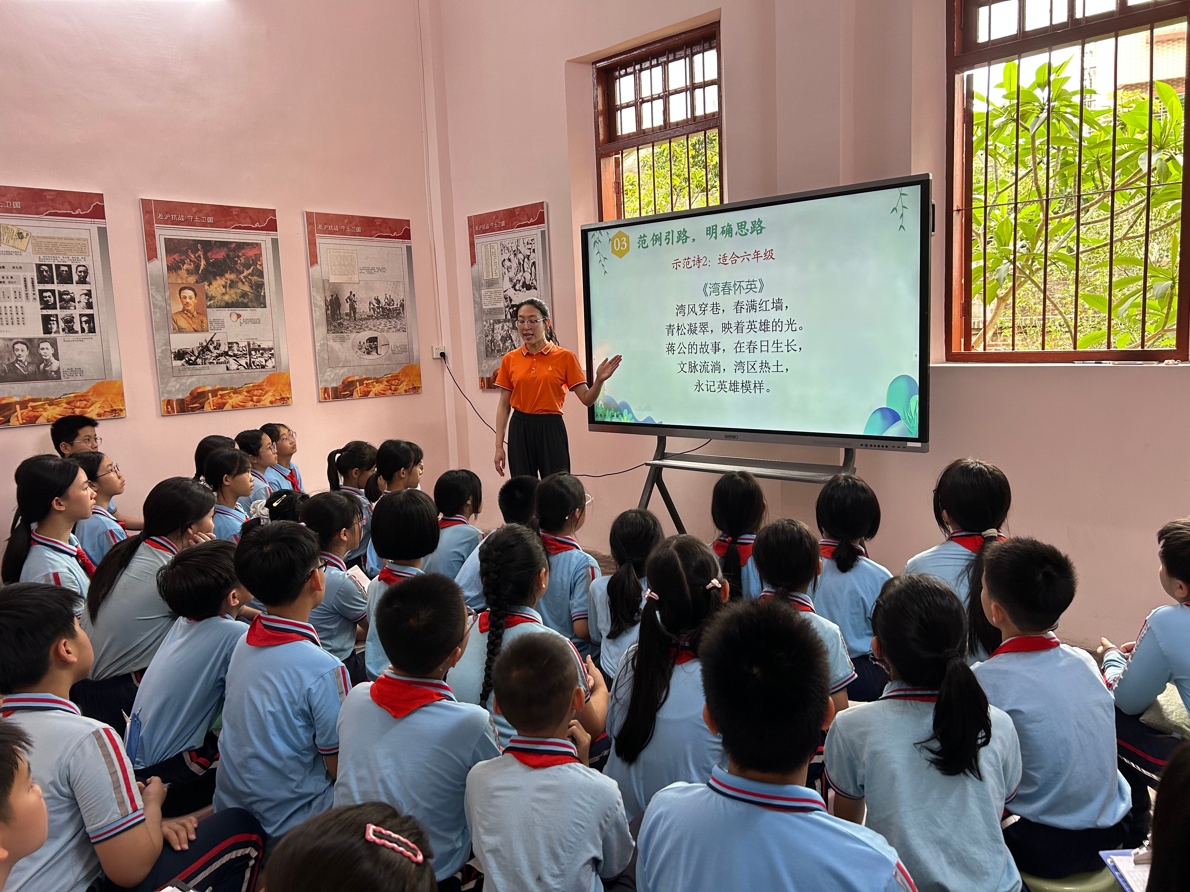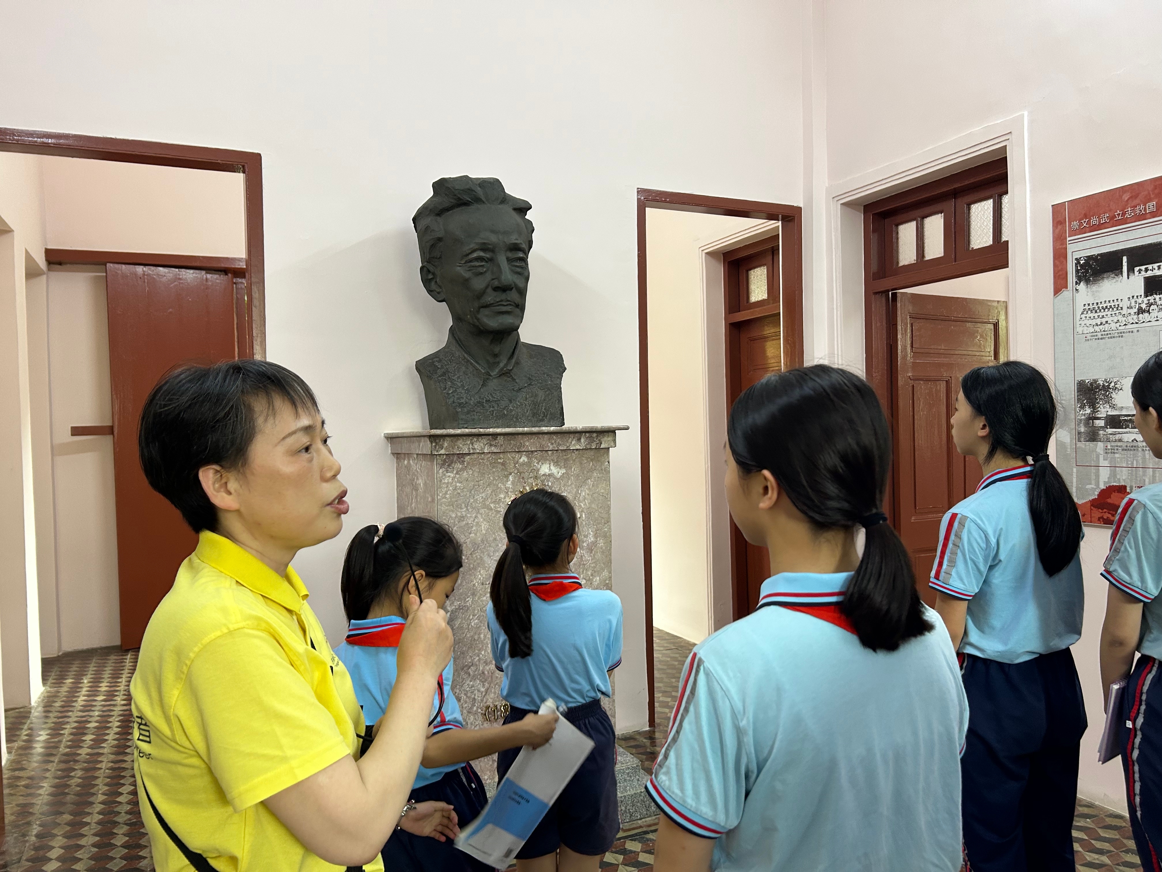 行径当天,同学们身着整皆投降、佩带瑰丽红围巾,在憨厚的提示下有序走进蒋光鼐故园。